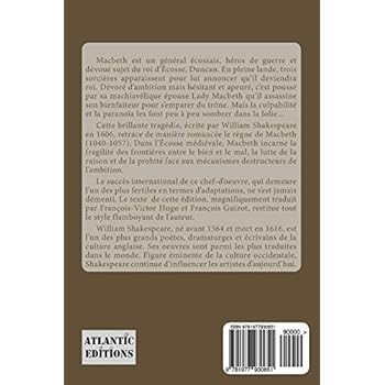 Edition intégrale en format broché Avec Atlantic Editions, plongez dans la lecture d'un des plus grands chefs-d'oeuvre de la littérature anglaise. Macbeth est un général écossais, héros de guerre et dévoué sujet du roi d'Écosse, Duncan. En pleine lande, trois sorcières apparaissent pour lui annoncer qu'il deviendra roi. Dévoré d'ambition mais hésitant et apeuré, c'est poussé par sa machiavélique épouse Lady Macbeth qu'il assassine son bienfaiteur pour s'emparer du trône. Mais la culpabilité et la paranoïa les font peu à peu sombrer dans la folie... Cette brillante tragédie, écrite par William Shakespeare en 1606, retrace de manière romancée le règne de Macbeth (1040-1057). Dans l'Écosse médiévale, Macbeth incarne la fragilité des frontières entre le bien et le mal, la lutte de la raison et de la probité face aux mécanismes destructeurs de l'ambition. Le succès international de ce chef-d'oeuvre, qui demeure l'un des plus fertiles en termes d'adaptations, ne s'est jamais démenti. Le texte de cette édition, magnifiquement traduit par François-Victor Hugo et François Guizot, restitue tout le style flamboyant de l'auteur. William Shakespeare, né avant 1564 et mort en 1616, est l'un des plus grands poètes, dramaturges et écrivains de la culture anglaise. Ses oeuvres sont parmi les plus traduites dans le monde. Figure éminente de la culture occidentale, Shakespeare continue d'influencer les artistes d'aujourd'hui. Ce chef-d'oeuvre incontournable et intemporel, témoignage de l'immense talent littéraire de l'auteur, ravira les lecteurs de tous âges. Retrouvez d'autres chefs-d'oeuvre de William Shakespeare chez Atlantic Editions : Roméo et Juliette: Edition intégrale - Traduction de François-Victor Hugo ISBN 978-1717598257 Hamlet: Edition intégrale - Traduction de François-Victor Hugo ISBN 978-1978274020 Othello: Edition intégrale - Traduction de François-Victor Hugo et François Guizot ISBN 978-1978390225 Le Roi Lear: Edition intégrale - Traduction de François-Victor Hugo ISBN 978-1986321198 © Atlantic Editions