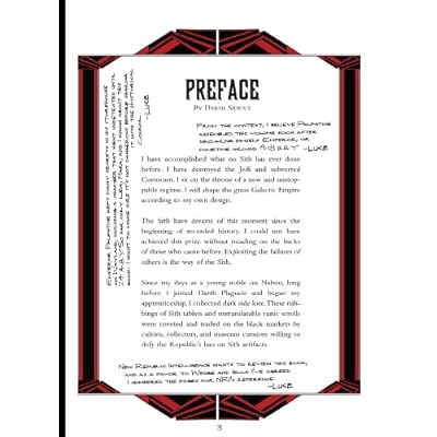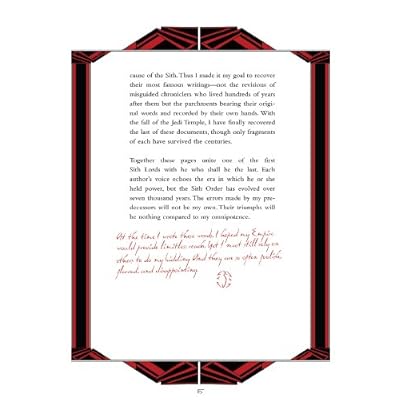 The Book of Sith hardcover is a beautifully crafted book made to look like an incomplete journal. Instead of a history of the Sith, we are treated to writings and musings of various Sith Lords throughout the ages. The overall narrative is given by Darth Sidious and he contributes various snark to other passages as well. Ventress, Luke Skywalker, Mace Windu and Yoda weigh in among others. The texture of each section is different and accurately represents its section.After opening thoughts, the first section chronicles the rise of the Sith Empire by Sorzus Syn. She was not a Sith, but subjugated the species and her group became their masters. How history might have been different if the Jedi has killed them instead of banishing their group instead at the end of the hundred year war. She details various Sith subspecies, weapons, armaments, amulets, houses of power, holocrons, war beasts, alchemy, incantations and prophecy.From there we find a bit of Darth Malgus' journal. These events happened before the book Deceived. The battle details are interesting and it is noted that he was not always supported in his efforts.Darth Babe weighs in on the Rule of Two, the closest this book comes to a guide on how the Sith order works. Apprentices are expected to kill their masters in that never ending search for power. This section also includes bits on lightsaber variants and combat, Dark Side combat and Sith armor.Mother Talzin described Wild Power of the Nightsisters, who reject the terms of light and dark sides of the Force. They are witches concerned with channel spirits of the living and dead. Palpatine particularly hates their point of view, though he does admire some aspects of their power.Darth Plagueis describes his experiments in alchemy, using midichorians to create and destroy life. A particular note by Luke Skywalker mentioned his horror at noting creation of a being with a high midichorian count, which turned out to be his father.Sidious closes out the book with his treaties on absolute power, the weakness of interiors and the book of anger. He believed he would live forever, such was his arrogance. The Rebel Alliance and Luke Skywalker out an end to that. I would've loved to see notes from Snoke and Kylo Ren, but this book was produced before the Force Awakens was released. A great read for Star Wars fans and a must for Dark Side lovers.