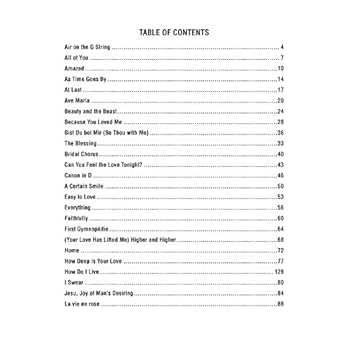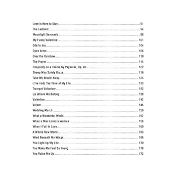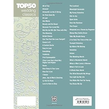 Fifty of the most popular wedding pieces from all genres of music This comprehensive folio spans the worlds of classical music pop and jazz. Each intermediate-level arrangement includes lyrics and chord symbols. Titles Air on the G String All of You Amazed As Time Goes By At Last Ave Maria Beauty and the Beast Because You Loved Me Bist Du bei Mir Be Thou with Me The Blessing Bridal Chorus Canon in D Can You Feel the Love Tonight A Certain Smile Easy to Love Everything Faithfully First Gymnopédie Your Love Has Lifted Me Higher and Higher Home How Deep Is Your Love How Do I Live I Swear Jesu Joy of Mans Desiring La vie en rose Love Is Here to Stay The Luckiest Moonlight Serenade My Funny Valentine Ode to Joy Open Arms Over the Rainbow The Prayer Rhapsody on a Theme by Paganini Sheep May Safely Graze Take My Breath Away Ive Had The Time of My Life Trumpet Voluntary Up Where We Belong Valentine Volare Wedding March What a Wonderful World When a Man Loves a Woman When I Fall In Love